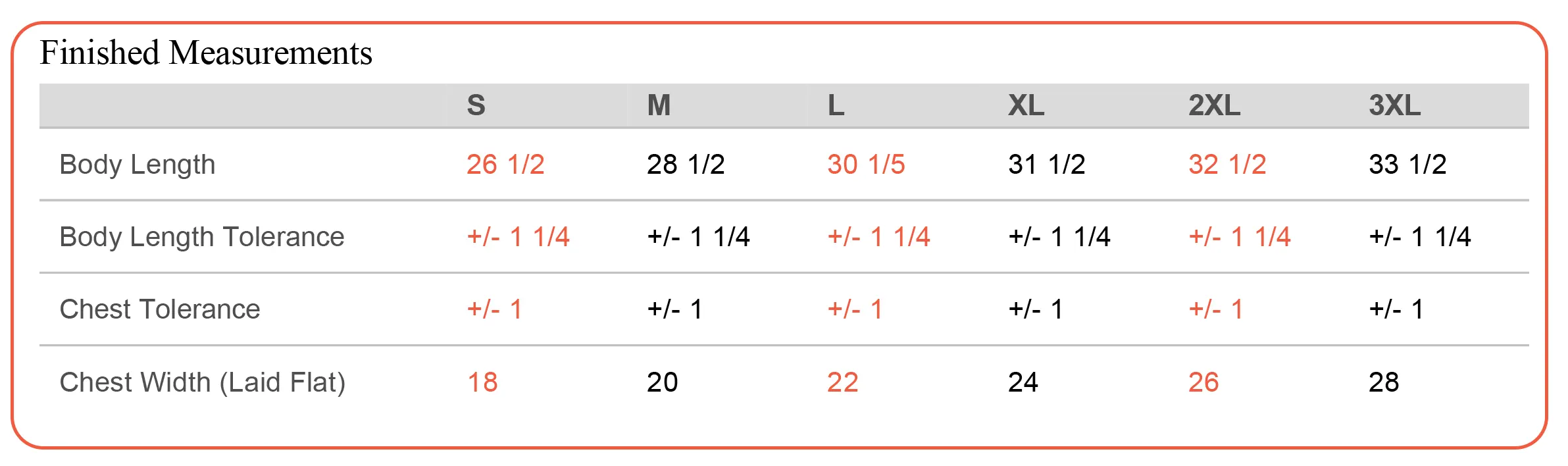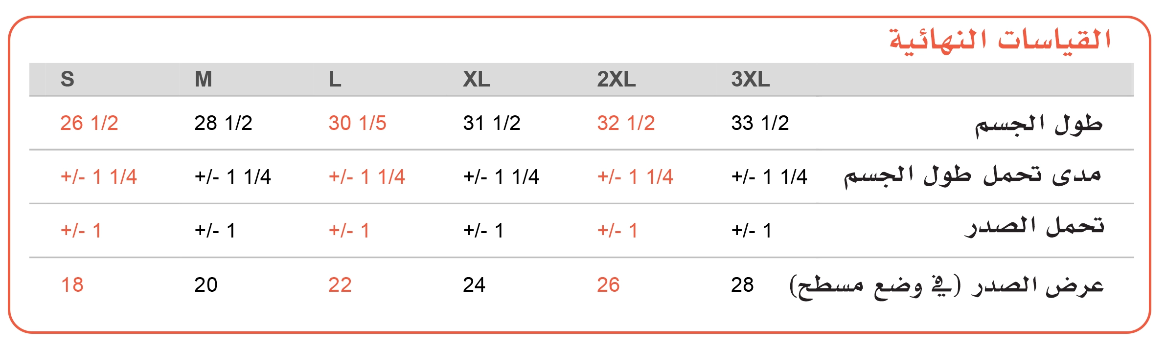 جدول المقاسات